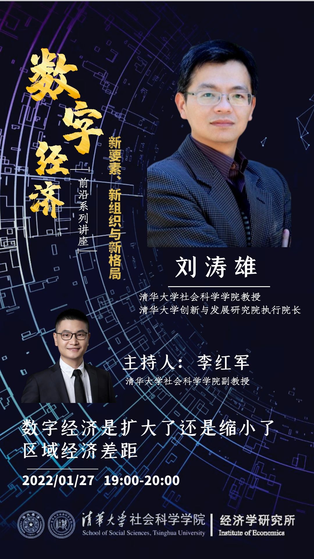创新与发展研究院执行院长刘涛雄做数字经济前沿系列讲座第七场报告,主题为数字经济是扩大还是缩小了区域经济差距,李红军副教授主持。