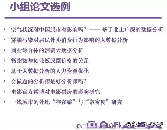 这是一些上课学生的项目的案例,有用来分析证券师,考试考得好的证券师是不是证券分析业绩也会好。对楼道商业综合体消费行为的分析,这都是一般的文科学生和理工科背景同学合作的项目。如果不通过理工科学生的帮助很难分析出来的一些东西。