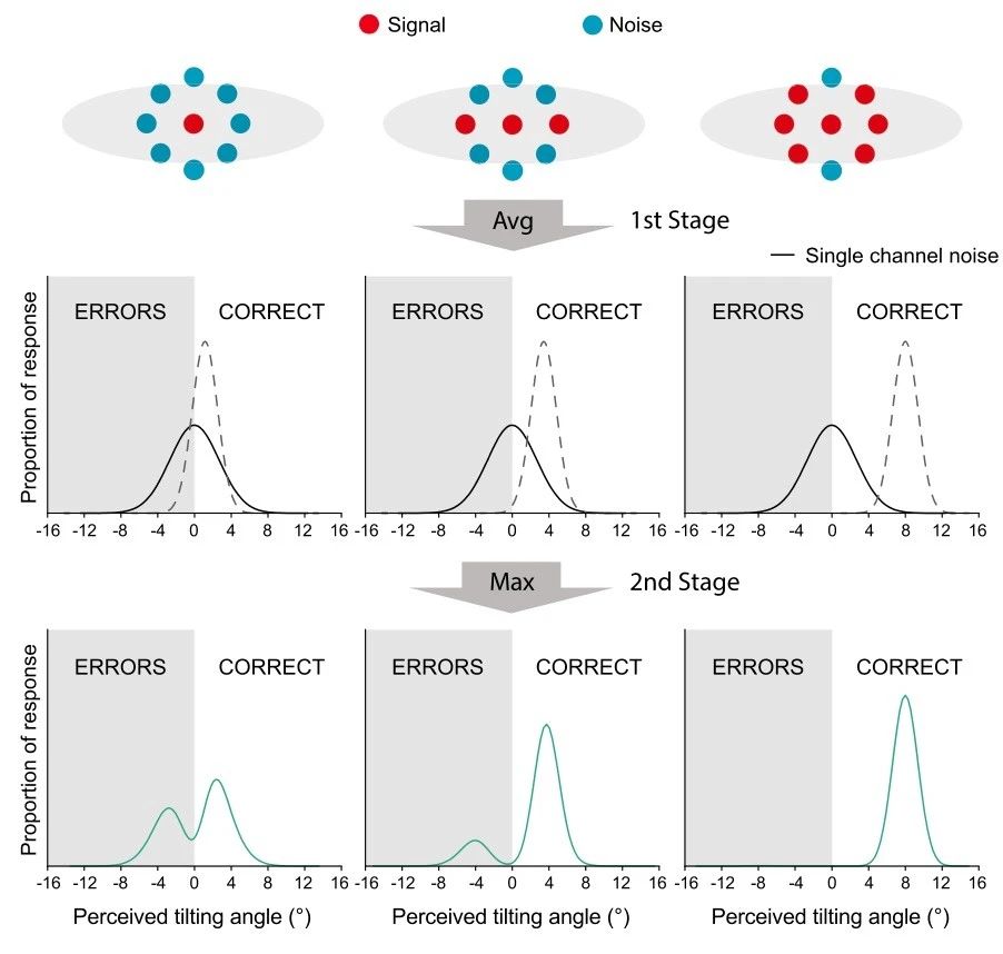 Avg-Max两阶段模型预测被试在不同信号强度下的响应分布,该模型先对沿注视点的径向整合区域中的信号进行平均,再对所有信号进行取最大值操作。