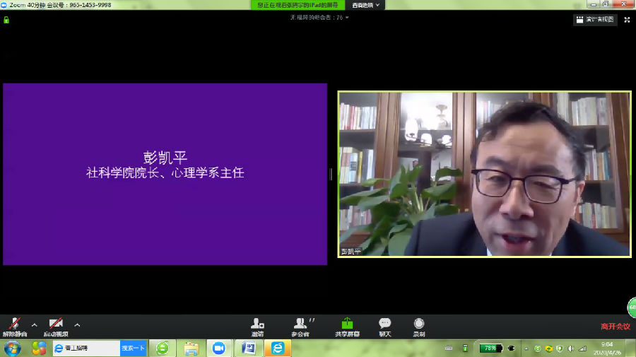 院长、心理学系主任彭凯平教授介绍了近期心理学系的主要工作,其中包括帮助师生防疫抗疫,300多名学生(包括33名留学生)及40多名教职人员无人感染;推动网络教学的无缝展开,积极开展心理康复科研攻关,推进人才引进和招生工作,以及国际合作和沟通工作等。其中,与北京幸福公益基金会联合主办的“抗击疫情,心理援助”公益项目得到23家机构的支持,共邀请62位国内知名心理学家、心理危机干预专家,开设120节线上课程,直接培训86万人次,回放观看233万人次,其他平台播放1500多场,培训600多万人次,累积培训上千万人次,为人类历史上最大规模的心理学普及工作。