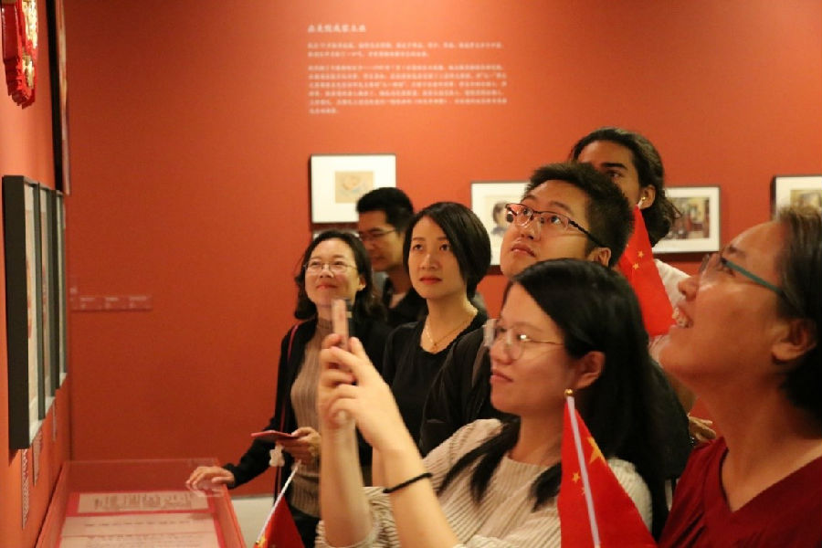 在《为新中国造型——周令钊先生百岁艺术展》主题展览中,师生们欣赏了百岁高龄的周令钊教授辉煌灿烂的艺术作品:抗日战争时期创作的抗战宣传画、为开国大典绘制的天安门城楼毛主席画像、亲自设计中华人民共和国国徽和中国人民政治协商会议会徽……他用艺术作品表达着个人发展和国家命运的紧紧相依,生动展现了中华民族从站起来、富起来到强起来的奋斗历程。