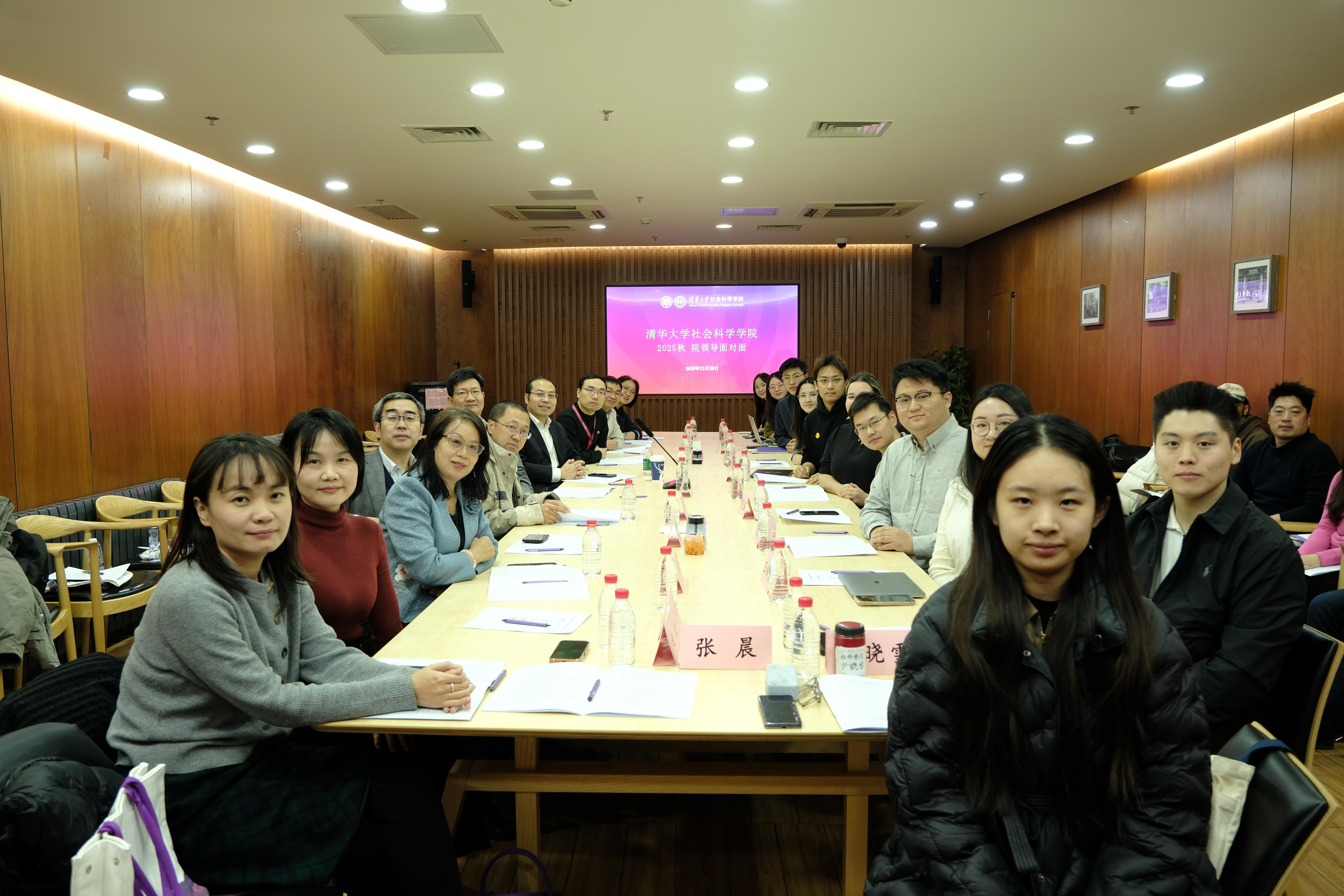 院长王天夫,党委书记孟天广,副院长孙秀林、刘丰,党委副书记李帮喜,战略发展合作与校友工作办公室主任肖红缨,研工组组长李正新出席会议,学工办、业务办相关负责老师以及学院本科生、研究生代表约30人参加会议。会议由2025级社会学系博士生杨媛主持。